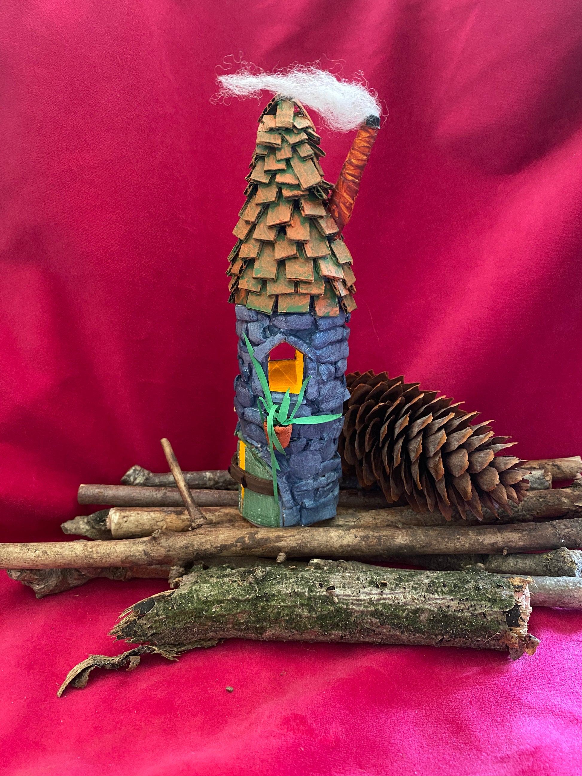 This Fairy Woodland House is expertly crafted using card, paper, clay, sheeps wool, and wire, combining natural textures with detailed artistry. It includes a battery-operated tealight candle that safely illuminates the piece, creating a warm, inviting glow. Ideal for adding a subtle, enchanting touch to your décor, this handcrafted model showcases both quality materials and skilled craftsmanship.